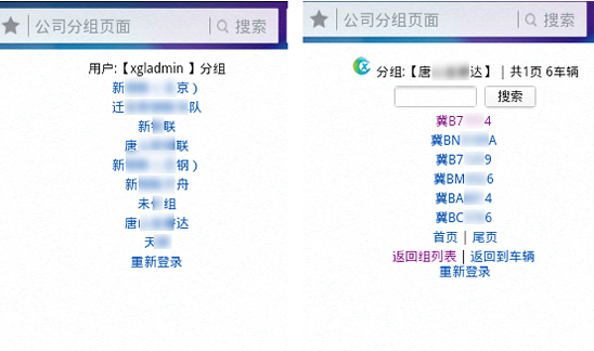 点击“登录”进入“用户分组”界面,在界面中选择分组名称,点击即可显示该分组下的所有车辆, 如下图: